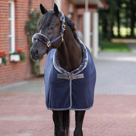 Die Show-Line Fleecedecke verfügt über einen Kunstpelzkragen, der der Decke Wärme und Stil verleiht. MIt den kontrastierenden Extras der Decke hebt sich Ihr Pferd stilvoll von der Masse ab.