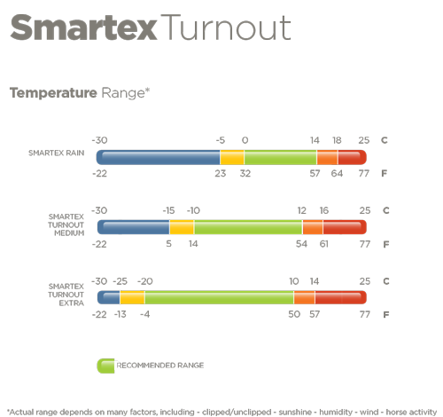 Temperaturbereich: 0° - 14°C (Der tatsächliche Bereich ist natürlich von vielen Faktoren abhängig. Sonne - Feuchtigkeit - Wind - Pferdeaktivität, geschoren oder ungeschoren).