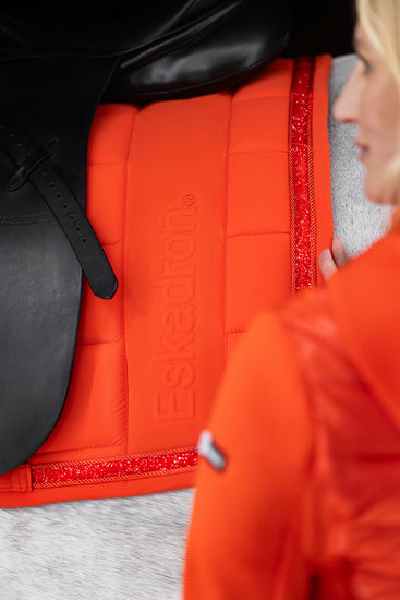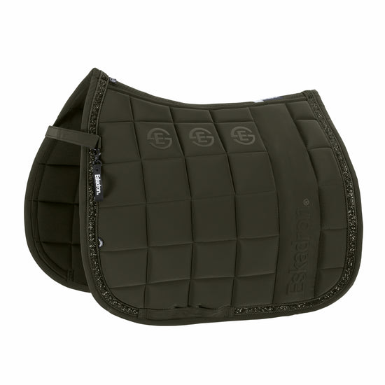 Die Schabracke Big Square Jewel Dynamic mit einem mattierenden Obermaterial und einer atmungsaktiven Cool-Dry-Unterseite für optimalen Komfort. Die voluminöse Big Square-Steppung sorgt für eine elegante Optik, ergänzt durch beidseitige Vertikalstreifen mit dezentem Eskadron-Stick. Anti-Slip-Silikonflächen im Sattelbereich bieten sicheren Halt, während das Innostrap-System und die Gurtschlaufe mit dreifacher Fixierung für perfekte Passform sorgen. Der Mesh-Rückenkanal gewährleistet eine effektive Luftzirkulation. Abgerundet wird das Design durch eine Kordel-Steinchen-Kordel-Kombination, beidseitige Flag-Labels und einen inklusiven Eskadron-Schlüsselanhänger.