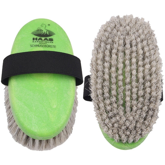 Die weichen, weißen Borsten der Schmusebürste sind ein Stück Extraliebe für das Pferd. Besonders für die empflindlichen Stellen.
